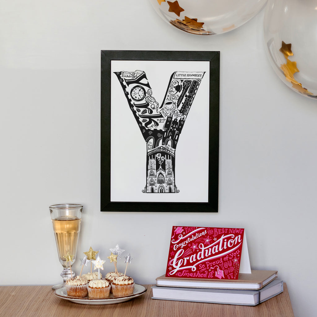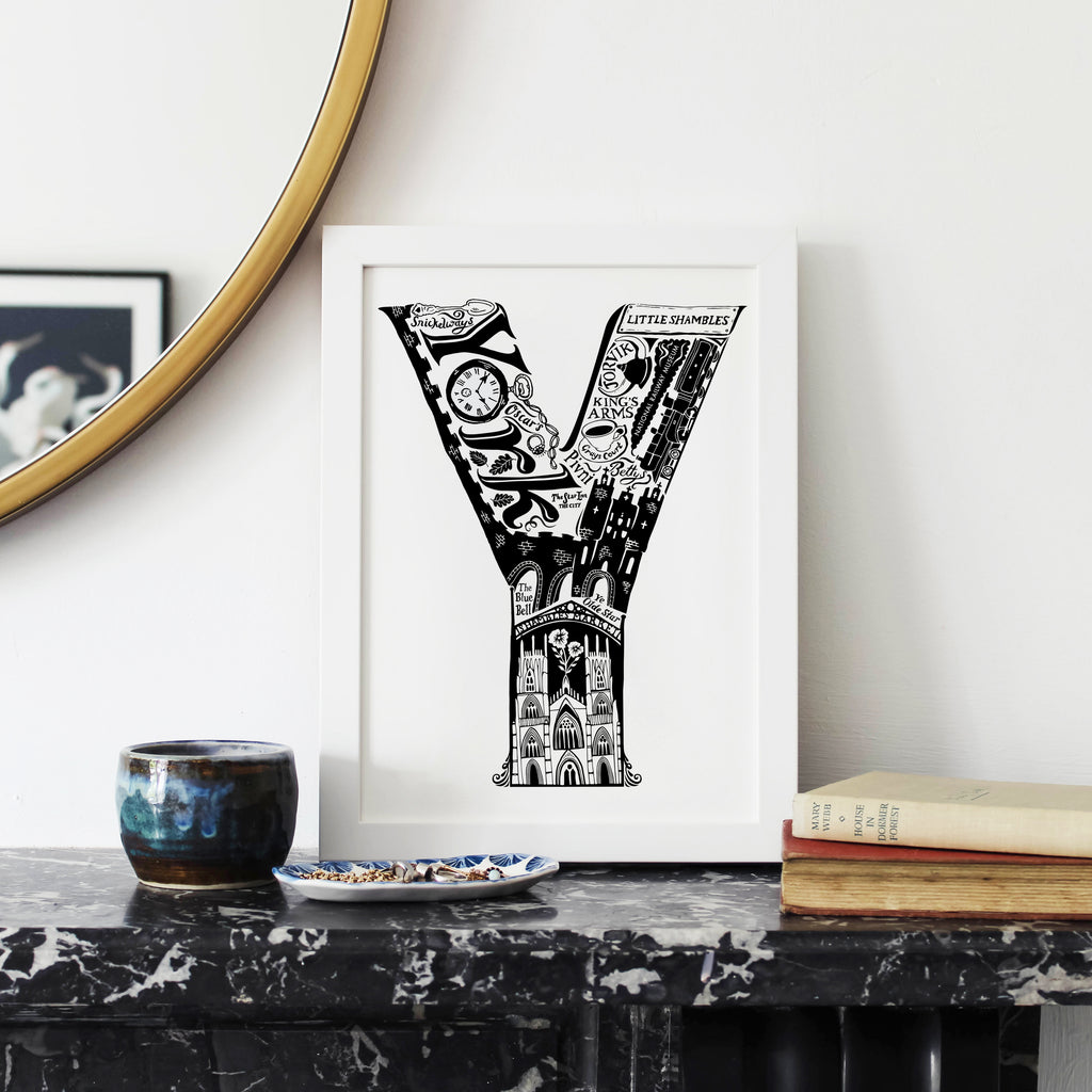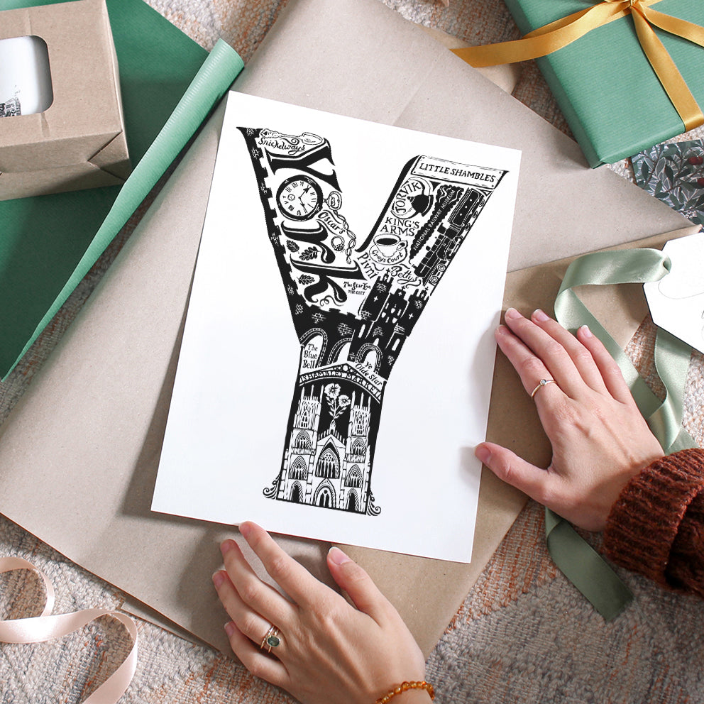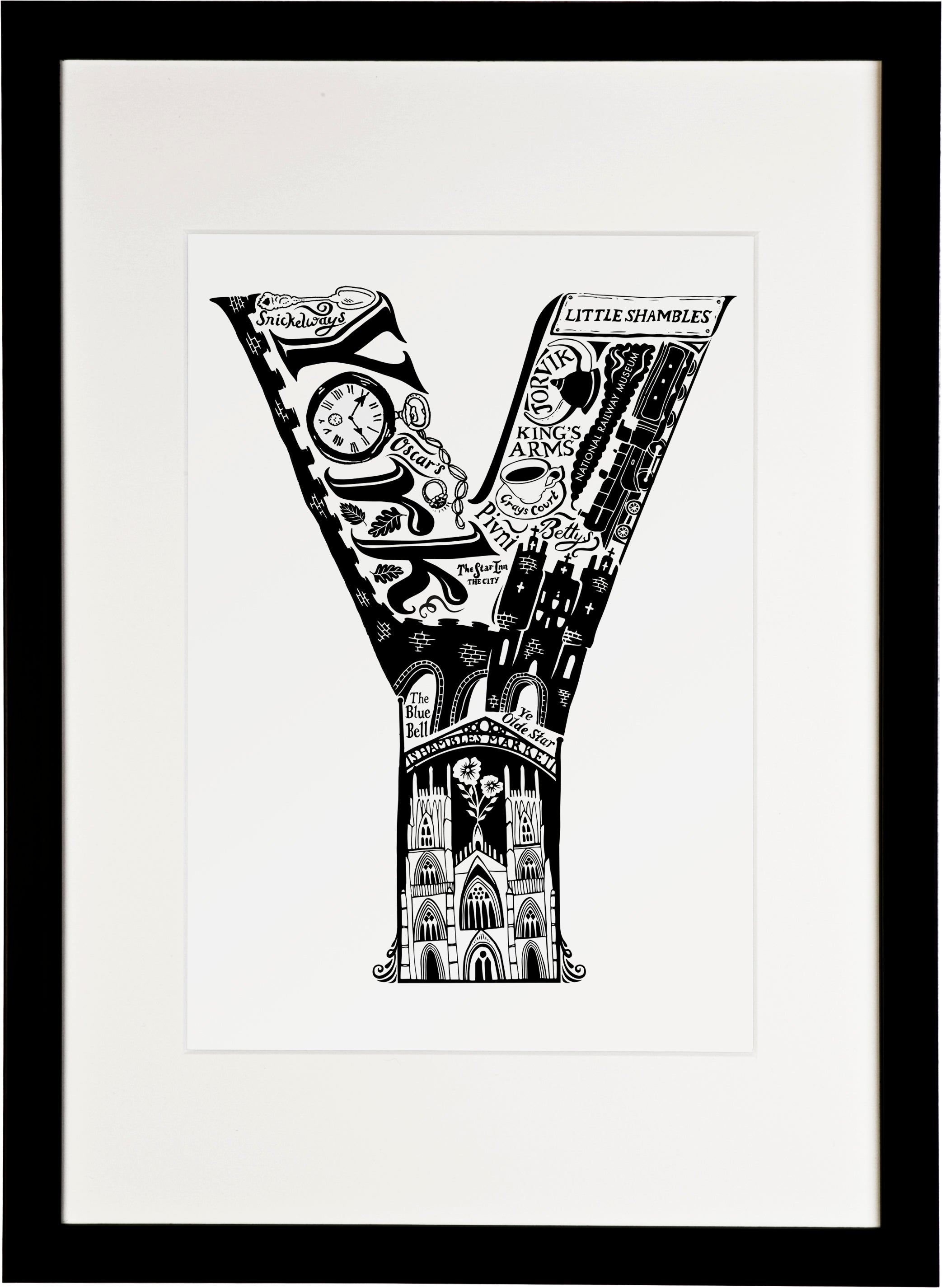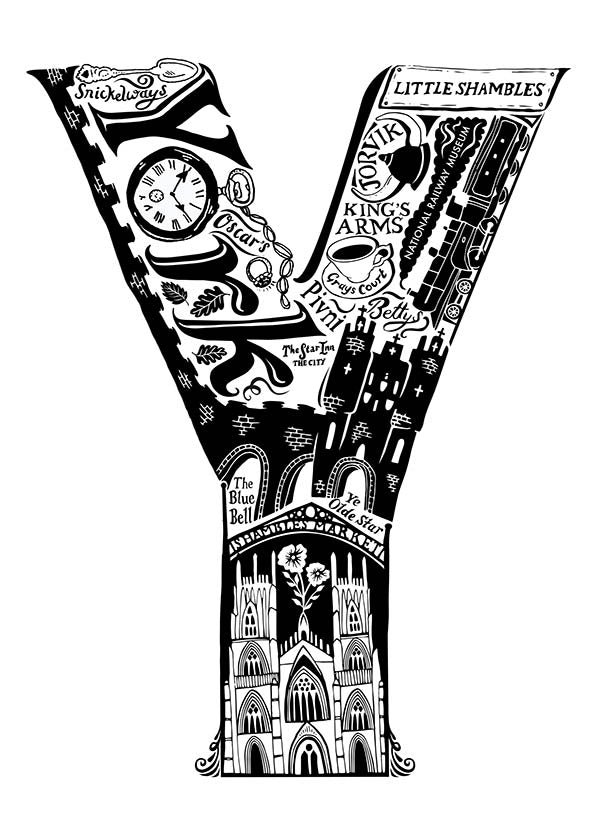 This beautiful black and white York print showcases all the things that make the city great. From the world famous York Minster and The National Railway Museum to local secrets like Snickelways and Pivni. The ideal personalised York gift.