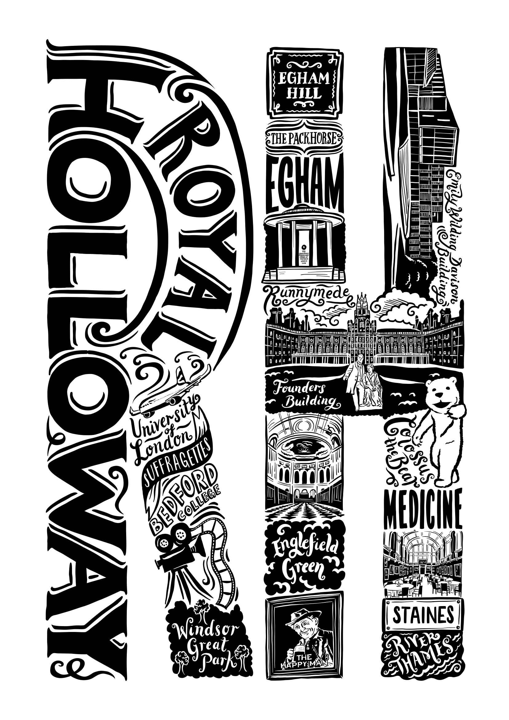 Inspired by suggestions from Royal Holloway students you can be sure it captures the essence of the place. From the incredible architecture, university mascot - Colossus the bear and the local areas where students live and go out - Egham, Windsor, Staines and Runnymede.